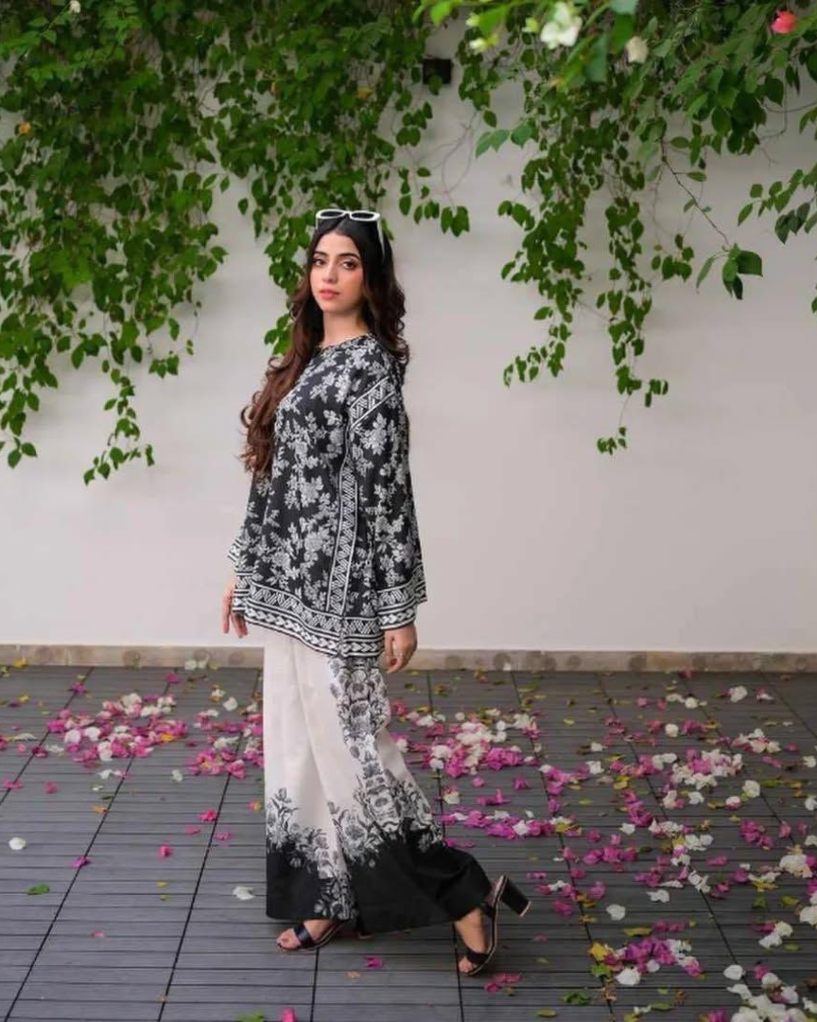 Crafted in luxurious raw silk, this 2-piece ensemble blends timeless minimalism with bold contrast. A plain black shirt with a structured square neckline pairs effortlessly with printed trousers, giving you a statement look that’s graceful yet grounded in simplicity.